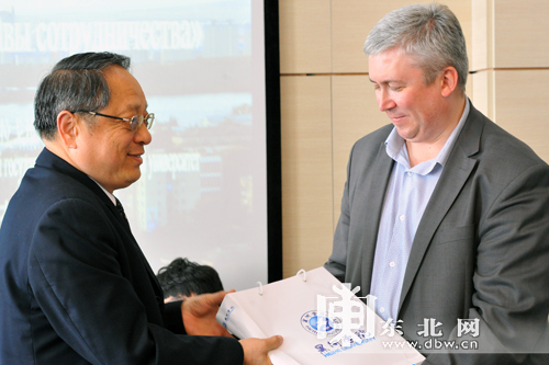 中俄高校领导互换礼物,共同期望,缔造两校教育交流和合作的新辉煌。