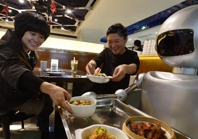 7月下旬起,江苏省苏州市印象城里的一台娱乐型机器人吸引了过往市民的目光,原来“她”是这里刚刚开业的一家机器人餐厅的迎宾小姐。这家餐厅约300平方米,由4个机器人和3个真人服务员搞定收银和所有的传菜、送菜等工作。同时,餐厅内还有一个完全由机器人组成的乐队和舞蹈队。